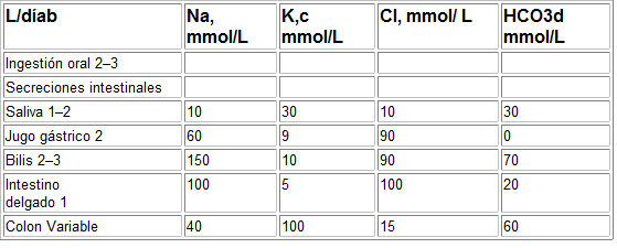 a Las secreciones intestinales son también ricas en cationes divalentes (Ca, Mg, Zn, Cu) y sus pérdidas aumentan en la esteatorrea, las fístulas intestinales altas o la aspiración prolongada.