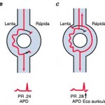 los esquemas, las líneas rojas indican la excitación en el nódulo AV, que se manifiesta en el ECG de superficie, y las líneas negras demuestran la conducción oculta que no se manifiesta en el electrocardiograma de superficie. A. Durante el ritmo sinusal (sinus rythm, NSR), el impulso desde la aurícula es conducido en las dos vías. Sin embargo, en el ECG de superficie sólo se manifiesta la conducción de la vía rápida, que produce un intervalo PR normal de 0.16 s. B. Una despolarización auricular prematura (atrial premature depolarization, APD) bloquea la vía rápida. El impulso es conducido por la vía lenta al haz de His y los ventrículos, produciendo un intervalo PR de 0.24 s. Como el impulso es prematuro, la conducción en esta vía es más lenta de lo que sería durante el ritmo sinusal. C. Un impulso auricular aún más prematuro bloquea la vía rápida y se conduce con más retraso en la vía lenta, originando un intervalo PR de 0.28 s. El impulso es conducido retrógradamente hasta la vía rápida, produciendo un eco auricular único. La reentrada sostenida se evita por el subsiguiente bloqueo de la vía lenta. D. Un impulso auricular todavía más prematuro bloquea inicialmente la vía rápida y es conducido en la vía lenta con un retraso mayor, con lo que origina un intervalo PR de 0.36 s. La conducción retrógrada tiene lugar en la vía rápida; se produce reentrada que origina taquicardia sostenida.