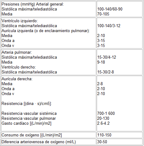 En un principio, la medición de las presiones del hemicardio derecho formaba parte de todos los cateterismos cardíacos, pero en la actualidad se emplea en menos del 25% de los procedimientos, ya que apenas añade información para la evaluación de los pacientes con CAD. No obstante, todavía resulta de utilidad cuando se sospecha la existencia de disfunción ventricular izquierda o derecha graves, valvulopatía, enfermedad miopericárdica o cortocircuito intracardíaco. El cateterismo del hemicardio derecho es semejante a la colocación de un catéter de Swan-Ganz a la cabecera del paciente en una unidad de cuidados intensivos, salvo que este procedimiento se practique con guía fluoroscópica. Se utiliza un catéter con balón de flotación que se hace avanzar desde una vena apropiada (femoral, braquial, subclavia o yugular interna) hasta la vena cava superior, donde se toman muestras de sangre para oximetría. Se sitúa después en la aurícula derecha para medir la presión. Se infla el balón con aire (o con dióxido de carbono si se sospecha un cortocircuito intracardíaco) y se hace pasar de forma secuencial por el ventrículo derecho, la arteria pulmonar y los puntos donde se mida la presión de enclavamiento pulmonar. Se registra la presión en cada posición; los valores normales de la presión medida durante el cateterismo cardíaco se resumen en el cuadro 212-3. Una vez medida la presión de enclavamiento (que se aproxima a la presión de la aurícula izquierda), se desinfla el balón para poder vigilar la presión en la arteria pulmonar y tomar muestras de sangre para oximetría. La comparación entre la saturación de oxígeno en las venas cavas superior e inferior, las cavidades del corazón derecho y la arteria pulmonar permite evaluar la presencia de un cortocircuito de izquierda a derecha en la aurícula, el ventrículo o la arteria pulmonar, que se manifiesta por un incremento (“reajuste”) de la saturación de oxígeno de la sangre a medida que atraviesa estos vasos y cavidades.
