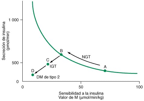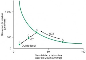 Cambios metabólicos que ocurren el desarollo de la diabetes mellitus (DM) de tipo 2. Le secreción de insulina y la sensibilidad a ésta se encuentran relacionados, y conforme el individio se hace más resistente a esta hormona (al pasar del punto A al punto B) se incrementa su secreción. La incapacidad de compensar el problema mediante aumento de la secreción de insulina da por resulto, inicialmente, trastorno de la tolerancia a la glucosa (IGT, punto C) y en última instancia DM de tipo 2 (punto D).