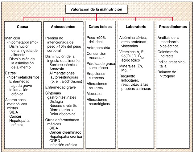 La elaboración de la historia clínica nutricional se basa en el conocimiento de las causas y aspectos fisiopatológicos de la malnutrición y debe concentrarse en los cambios ocurridos en la alimentación y en el peso corporal, situación socioeconómica y síntomas que son peculiares de cada situación clínica. Las situaciones sociales y económicas que pueden culminar en pobreza y malnutrición incluyen bajos ingresos, indigencia, uso de drogas o alcoholismo crónico. Durante las parrandas desenfrenadas de los alcohólicos crónicos es característico que el etanol aporte más de 50% de las calorías diarias ingeridas; la catabolia del etanol consume energía y permite que actúe un metabolismo “no equilibrado” de grasas y carbohidratos. Con arreglo a la gravedad de la lesión o la enfermedad, los pacientes quirúrgicos y médicos en estado crítico pueden mostrar, evidentemente, PCM por estrés, si no se satisfacen sus mayores necesidades nutricionales después de cinco a 10 días. El individuo malnutrido cuyo problema proviene de trastornos del aparato digestivo puede quejarse de disfagia o vómito recurrente, diarrea crónica o dolor abdominal repetitivo que se exacerba con el consumo de alimentos. En el servicio de medicina general, la PCM puede ser parte integral del cuadro inicial de pancreatitis recurrente crónica, insuficiencia renal, hepatopatía crónica, neumopatía obstructiva crónica, cáncer diseminado o infecciones crónicas, como SIDA o tuberculosis.