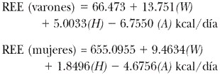El REE es directamente proporcional tanto a la FFM como a la BCM y en las personas sanas puede calcularse mediante la fórmula de Harris y Benedict a partir del peso corporal en kg (weight, W), la estatura en centímetros (height, H) y la edad en años (age, A):