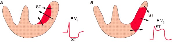 La isquemia aguda produce una corriente de lesión. Cuando predomina la isquemia subendocárdica (A) el vector ST resultante se dirige hacia la cara interna del ventrículo afectado y la cavidad ventricular. Por eso, las derivaciones situadas por encima registran una depresión de ST. Cuando la isquemia afecta a la capa ventricular externa (B) (lesión transmural o epicárdica), el vector ST se dirige hacia fuera. Las derivaciones situadas por encima registran una elevación de ST.