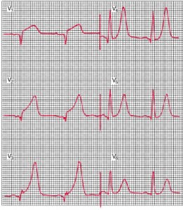 Fase hiperaguda del infarto miocárdico (myocardial infarction, MI) anteroseptal. Obsérvense las ondas T picudas y positivas (V2 a V3) junto con la elevación delsegmento ST y la onda Q (V1 a V3).