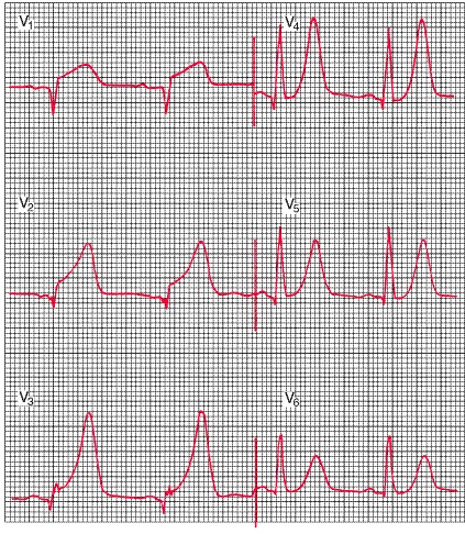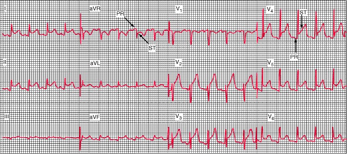 La pericarditis aguda suele producir un patrón de elevación difusa del segmento ST (en este caso, en las derivaciones I, II, aVF y V2 a V6) por la corriente de lesión ventricular. Obsérvese la desviación característica del segmento PR (de polaridad opuesta al segmento ST) debida a una corriente de lesión auricular concomitante.