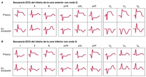 Secuencia de los cambios de despolarización y repolarización en (A) el infarto agudo de la cara anterior con onda Q y (B) de la cara inferior con onda Q. En los infartos de la pared anterior, la elevación de ST en las derivaciones I, aVL y precordiales se acompaña de una depresión recíproca en las derivaciones II, III y aVF. Por el contrario, el infarto agudo de la cara inferior (o posterior) se vincula con depresión recíproca del ST en las derivaciones V1 a V3.