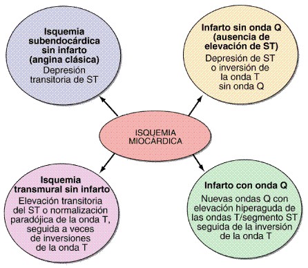 Variabilidad de los patrones ECG con isquemia miocárdica. El ECG puede ser normal o mostrar anomalías inespecíficas. Además, estas categorías no se excluyen mutuamente. Así, un infarto sin elevación de ST puede evolucionar hacia un infarto con onda Q, una elevación del ST puede seguirse de un infarto sin onda Q o bien las depresiones del ST con inversión de la onda T pueden acabar evolucionando a un infarto con onda Q.