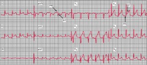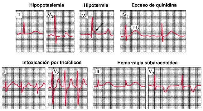 Las alteraciones metabólicas, los medicamentos y otros factores pueden prolongar la repolarización ventricular y alargar el intervalo QT o causar ondas U prominentes. La prolongación de la repolarización, sobre todo cuando se debe a hipopotasiemia o a ciertos fármacos, revela una mayor predisposición a la taquicardia ventricular polimorfa. La hipotermia provoca una “joroba” convexa característica en el punto J (onda de Osborn, flecha). Obsérvese la prolongación de los intervalos QRS y QT, así como la taquicardia sinusal que se produce en las intoxicaciones por antidepresivos tricíclicos.