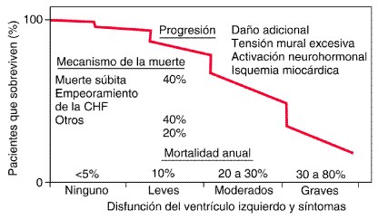 Evolución natural de la insuficiencia cardíaca congestiva (congestive heart failure, CHF). Una vez que se establece la disfunción sistólica del ventrículo izquierdo, suele progresar, aunque de forma imprevisible. A medida que avanza la disfunción ventricular izquierda y aumentan los síntomas, se eleva la tasa de mortalidad y el proceso se torna inexorable. La destrucción de los miocitos y la fibrosis se vuelven irreversibles. Por ello, hay que aplicar una medida preventiva eficaz antes del comienzo o en las primeras fases de la disfunción ventricular izquierda. (De BM Massie, NH Shah:) Curr Opin Cardiol 11:221, 1996; con autorización.