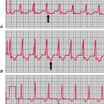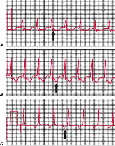 Ejemplos de taquicardia supraventricular (SVT). Las flechas indican las ondas P. A. Reentrada del nudo AV. Se identifican las ondas P positivas al final del complejo QRS. B. Reentrada AV que se vale de una vía de derivación oculta. Las ondas P retrógradas invertidas se sobreañaden a las ondas T. C. Taquicardia auricular automática. Las ondas P invertidas siguen a las ondas T y anteceden al complejo QRS.