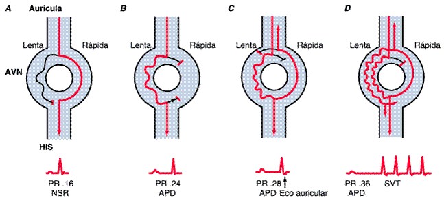 los esquemas, las líneas rojas indican la excitación en el nódulo AV, que se manifiesta en el ECG de superficie, y las líneas negras demuestran la conducción oculta que no se manifiesta en el electrocardiograma de superficie. A. Durante el ritmo sinusal (sinus rythm, NSR), el impulso desde la aurícula es conducido en las dos vías. Sin embargo, en el ECG de superficie sólo se manifiesta la conducción de la vía rápida, que produce un intervalo PR normal de 0.16 s. B. Una despolarización auricular prematura (atrial premature depolarization, APD) bloquea la vía rápida. El impulso es conducido por la vía lenta al haz de His y los ventrículos, produciendo un intervalo PR de 0.24 s. Como el impulso es prematuro, la conducción en esta vía es más lenta de lo que sería durante el ritmo sinusal. C. Un impulso auricular aún más prematuro bloquea la vía rápida y se conduce con más retraso en la vía lenta, originando un intervalo PR de 0.28 s. El impulso es conducido retrógradamente hasta la vía rápida, produciendo un eco auricular único. La reentrada sostenida se evita por el subsiguiente bloqueo de la vía lenta. D. Un impulso auricular todavía más prematuro bloquea inicialmente la vía rápida y es conducido en la vía lenta con un retraso mayor, con lo que origina un intervalo PR de 0.36 s. La conducción retrógrada tiene lugar en la vía rápida; se produce reentrada que origina taquicardia sostenida.