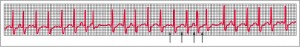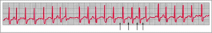 Taquicardia auricular multifocal. Tira de ritmo de la derivación I en la que se observa una taquicardia auricular multifocal definida por 3 ondas P consecutivas con una forma variable y una frecuencia >100 lpm (flechas).