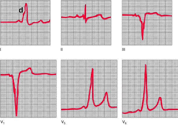 ECG en el síndrome de Wolff-Parkinson-White. Existe un intervalo corto PR (0.11 s), un complejo QRS amplio (0.12 s) y un ascenso poco nítido del QRS debido a la activación ventricular precoz por la vía de derivación (onda delta, d en la derivación I). Las ondas delta negativas en V1 son diagnosticas de una vía de derivación derecha. Obsérvese la onda Q (onda delta negativa) en la derivación III, que simula un infarto de miocardio.
