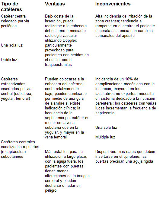 Los catéteres centrales introducidos por vía periférica son la opción más barata para la nutrición parenteral a corto plazo. Los receptáculos con puertas de entrada y los que se implantan haciendo un túnel subcutáneo han de ser insertados en el quirófano y son más estables para su utilización a largo plazo. Los catéteres centrales deben cambiarse cuando esté clínicamente indicado; los cambios sistemáticos resultan caros y arriesgados. Las soluciones de clorhexidina son un antiséptico local más eficaz que el yodo o el alcohol. Aunque los apósitos transparentes son útiles para estabilizar los catéteres y permiten observar con facilidad la piel de la zona, la incidencia de septicemia relacionada con el catéter es mayor con ellos que con los apósitos tradicionales de gasas secas; se están investigando apósitos transparentes más modernos que retienen menos la humedad. Los catéteres de Silastic o poliuretano producen menos complicaciones que los de cloruro de polivinilo. Diversos tipos de sistemas sin agujas emplean válvulas centradas, pero los índices de contaminación son mayores con estos sistemas cuando se utilizan para la nutrición parenteral a largo plazo.
