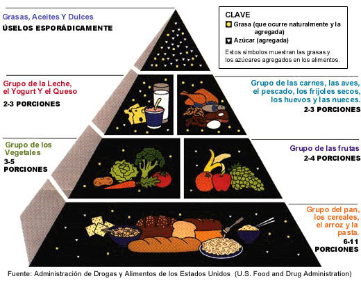 alimentarios o los cuestionarios sobre la frecuencia de los alimentos. Una guía alimentaria muy utilizada para las personas sanas es la pirámide de alimentos del USDA, que resulta útil como base para la identificación de las ingestas deficientes de nutrientes esenciales, así como para detectar los posibles excesos de grasa, de grasa saturada, de sodio, de azúcar y de alcohol . La guía se ajusta según varíe el número de raciones para cubrir las necesidades de personas de diferentes edades y en distintas fases del ciclo de vida; los individuos que respetan costumbres étnicas en su alimentación o que siguen esquemas poco comunes quizá necesiten orientación adicional sobre la forma de clasificar los alimentos y sobre las raciones que constituyen una ración apropiada. Al revisar la guía con la persona se le ayuda a establecer una transición hacia un esquema alimentario más sano y a identificar grupos de alimentos que se consumen en cantidades superiores a las recomendadas o que, por lo contrario, no son suficientes. En cuanto a los que reciben dietas terapéuticas, puede resultar útil hacer una valoración comparada utilizando las listas de intercambio de alimentos. Entre éstas se encuentran, por ejemplo, la lista de intercambio para la diabetes de la American Diabetes Association o las listas para intercambio de alimentos para enfermos renales de la American Dietetic Association.