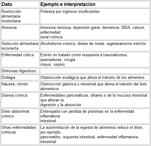 La elaboración de la historia clínica nutricional se basa en el conocimiento de las causas y aspectos fisiopatológicos de la malnutrición y debe concentrarse en los cambios ocurridos en la alimentación y en el peso corporal, situación socioeconómica y síntomas que son peculiares de cada situación clínica. Las situaciones sociales y económicas que pueden culminar en pobreza y malnutrición incluyen bajos ingresos, indigencia, uso de drogas o alcoholismo crónico. Durante las parrandas desenfrenadas de los alcohólicos crónicos es característico que el etanol aporte más de 50% de las calorías diarias ingeridas; la catabolia del etanol consume energía y permite que actúe un metabolismo “no equilibrado” de grasas y carbohidratos. Con arreglo a la gravedad de la lesión o la enfermedad, los pacientes quirúrgicos y médicos en estado crítico pueden mostrar, evidentemente, PCM por estrés, si no se satisfacen sus mayores necesidades nutricionales después de cinco a 10 días. El individuo malnutrido cuyo problema proviene de trastornos del aparato digestivo puede quejarse de disfagia o vómito recurrente, diarrea crónica o dolor abdominal repetitivo que se exacerba con el consumo de alimentos. En el servicio de medicina general, la PCM puede ser parte integral del cuadro inicial de pancreatitis recurrente crónica, insuficiencia renal, hepatopatía crónica, neumopatía obstructiva crónica, cáncer diseminado o infecciones crónicas, como SIDA o tuberculosis.