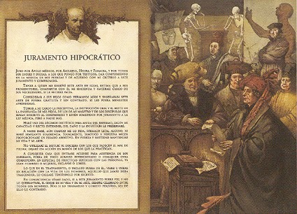 Juro por Apolo el Médico y Esculapio y por Hygeia y Panacea y por todos los dioses y diosas, poniéndolos de jueces, que este mi juramento será cumplido hasta donde tenga poder y discernimiento. A aquel quien me enseñó este arte, le estimaré lo mismo que a mis padres; él participará de mi mandamiento y si lo desea participará de mis bienes. Consideraré su descendencia como mis hermanos, enseñándoles este arte sin cobrarles nada, si ellos desean aprenderlo.