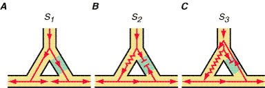 Esquema de la reentrada. La ramificación en Y del sistema de Purkinje hacia el músculo ventricular se muestra en las imágenes A a C. El componente de la derecha (área azul) del sistema de Purkinje muestra un período refractario mayor que el de la izquierda. A. Si se aplica una frecuencia de estimulación lenta (S1), la conducción transcurre de manera normal por las dos fibras de Purkinje, provocando una colisión en el músculo ventricular. B. Un estímulo prematuro (S2) bloquea la fibra de la vía de la derecha y retrasa la conducción por la izquierda. Este impulso se conduce hasta el ventrículo y trata de reentrar por el lugar inicial del bloqueo, pero sin éxito, porque esta zona aún no ha recuperado completamente su excitabilidad. C. Un estímulo aún más precoz (S3) determina nuevamente un bloqueo en la vía de la izquierda. La propagación más lenta por la fibra izquierda da tiempo a que regrese el impulso por el lugar del bloqueo inicial y vuelva a ser conducido, produciéndose así el circuito de reentrada.